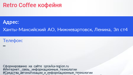 Retro Coffee, кофейня по адресу Ханты-Мансийский АО, Нижневартовск, Ленина, 3п ст4 в дальнейшем Организация, размещена в следующих категориях: