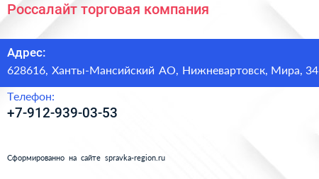 Россалайт, торговая компания по адресу 628616, Ханты-Мансийский АО, Нижневартовск, Мира, 34 в дальнейшем Организация, размещена в следующих категориях: