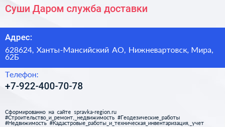 Суши Даром, служба доставки по адресу 628624, Ханты-Мансийский АО, Нижневартовск, Мира, 62Б в дальнейшем Организация, размещена в следующих категориях: