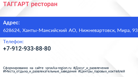 ТАГГАРТ, ресторан по адресу 628624, Ханты-Мансийский АО, Нижневартовск, Мира, 93 в дальнейшем Организация, размещена в следующих категориях: