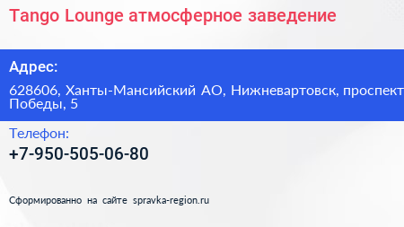 Tango Lounge, атмосферное заведение по адресу 628606, Ханты-Мансийский АО, Нижневартовск, проспект Победы, 5 в дальнейшем Организация, размещена в следующих категориях: