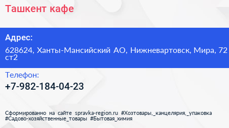Ташкент, кафе по адресу 628624, Ханты-Мансийский АО, Нижневартовск, Мира, 72 ст2 в дальнейшем Организация, размещена в следующих категориях:
