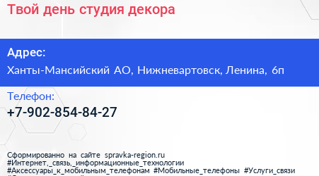 Твой день, студия декора по адресу Ханты-Мансийский АО, Нижневартовск, Ленина, 6п в дальнейшем Организация, размещена в следующих категориях: