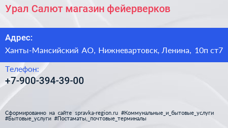 Урал Салют, магазин фейерверков по адресу Ханты-Мансийский АО, Нижневартовск, Ленина, 10п ст7 в дальнейшем Организация, размещена в следующих категориях: