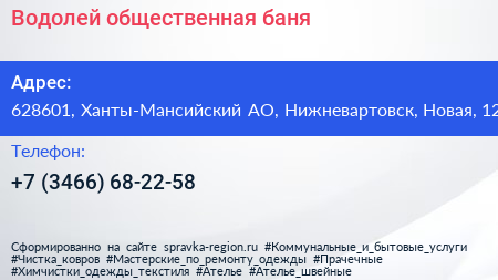 Водолей, общественная баня по адресу 628601, Ханты-Мансийский АО, Нижневартовск, Новая, 12 в дальнейшем Организация, размещена в следующих категориях: