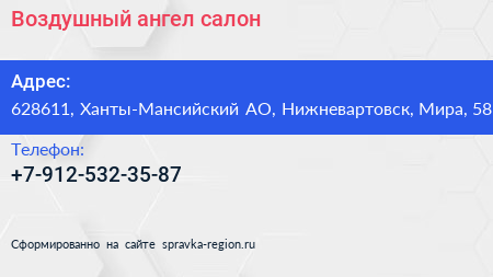 Воздушный ангел, салон по адресу 628611, Ханты-Мансийский АО, Нижневартовск, Мира, 58 в дальнейшем Организация, размещена в следующих категориях: