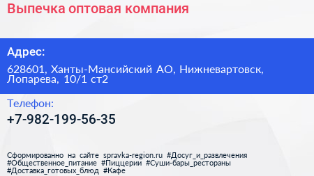 Выпечка, оптовая компания по адресу 628601, Ханты-Мансийский АО, Нижневартовск, Лопарева, 10/1 ст2 в дальнейшем Организация, размещена в следующих категориях: