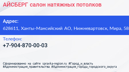 АЙСБЕРГ, салон натяжных потолков по адресу 628611, Ханты-Мансийский АО, Нижневартовск, Мира, 58 в дальнейшем Организация, размещена в следующих категориях: