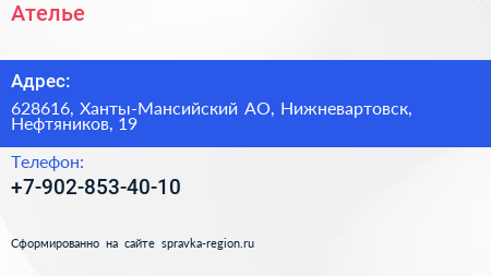 Ателье по адресу 628616, Ханты-Мансийский АО, Нижневартовск, Нефтяников, 19 в дальнейшем Организация, размещена в следующих категориях:
