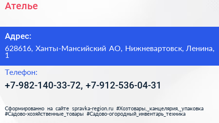 Ателье по адресу 628616, Ханты-Мансийский АО, Нижневартовск, Ленина, 1 в дальнейшем Организация, размещена в следующих категориях: