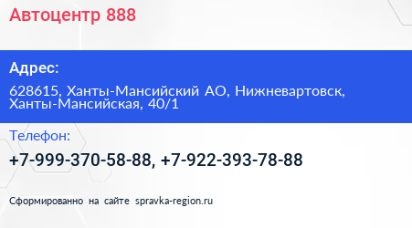 Автоцентр-888 по адресу 628615, Ханты-Мансийский АО, Нижневартовск, Ханты-Мансийская, 40/1 в дальнейшем Организация, размещена в следующих категориях: