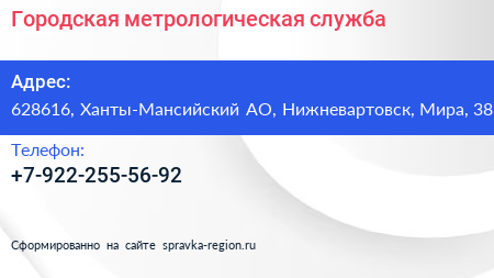 Городская метрологическая служба по адресу 628616, Ханты-Мансийский АО, Нижневартовск, Мира, 38 в дальнейшем Организация, размещена в следующих категориях: