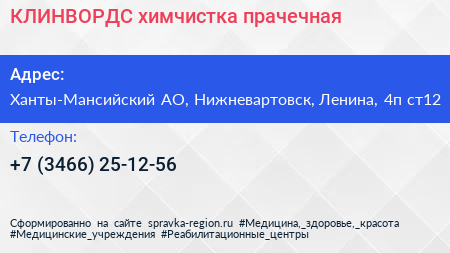 КЛИНВОРДС, химчистка-прачечная по адресу Ханты-Мансийский АО, Нижневартовск, Ленина, 4п ст12 в дальнейшем Организация, размещена в следующих категориях: