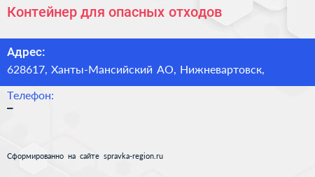 Контейнер для опасных отходов по адресу 628617, Ханты-Мансийский АО, Нижневартовск, в дальнейшем Организация, размещена в следующих категориях: