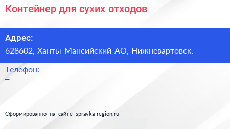 Контейнер для сухих отходов по адресу 628602, Ханты-Мансийский АО, Нижневартовск, в дальнейшем Организация, размещена в следующих категориях: