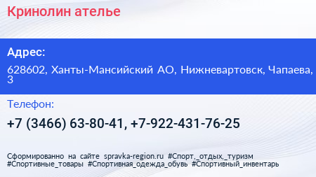 Кринолин, ателье по адресу 628602, Ханты-Мансийский АО, Нижневартовск, Чапаева, 3 в дальнейшем Организация, размещена в следующих категориях: