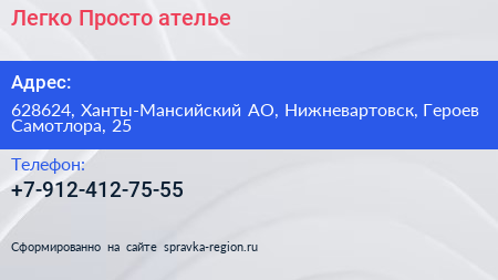 Легко & Просто, ателье по адресу 628624, Ханты-Мансийский АО, Нижневартовск, Героев Самотлора, 25 в дальнейшем Организация, размещена в следующих категориях: