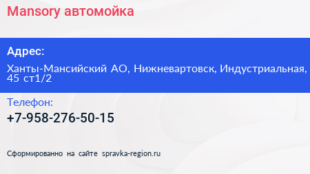 Mansory, автомойка по адресу Ханты-Мансийский АО, Нижневартовск, Индустриальная, 45 ст1/2 в дальнейшем Организация, размещена в следующих категориях: