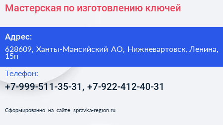 Мастерская по изготовлению ключей по адресу 628609, Ханты-Мансийский АО, Нижневартовск, Ленина, 15п в дальнейшем Организация, размещена в следующих категориях: