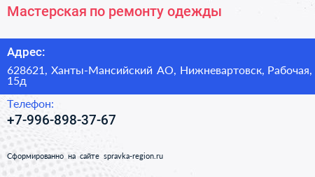 Мастерская по ремонту одежды по адресу 628621, Ханты-Мансийский АО, Нижневартовск, Рабочая, 15д в дальнейшем Организация, размещена в следующих категориях: