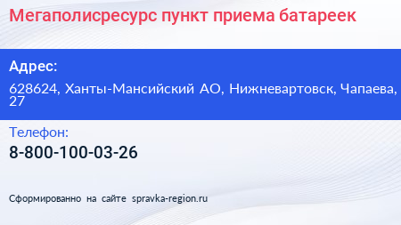 Мегаполисресурс, пункт приема батареек по адресу 628624, Ханты-Мансийский АО, Нижневартовск, Чапаева, 27 в дальнейшем Организация, размещена в следующих категориях: