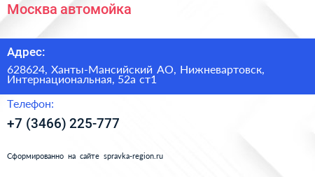 Москва, автомойка по адресу 628624, Ханты-Мансийский АО, Нижневартовск, Интернациональная, 52а ст1 в дальнейшем Организация, размещена в следующих категориях: