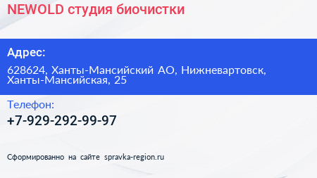 NEWOLD, студия биочистки по адресу 628624, Ханты-Мансийский АО, Нижневартовск, Ханты-Мансийская, 25 в дальнейшем Организация, размещена в следующих категориях: