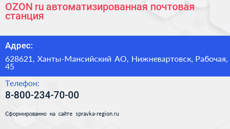 OZON.ru, автоматизированная почтовая станция по адресу 628621, Ханты-Мансийский АО, Нижневартовск, Рабочая, 45 в дальнейшем Организация, размещена в следующих категориях: