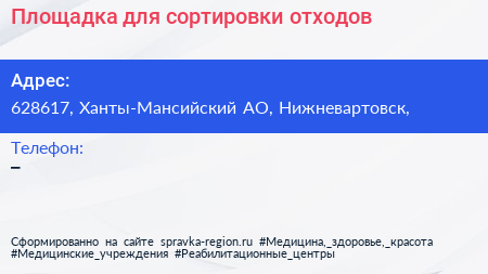 Площадка для сортировки отходов по адресу 628617, Ханты-Мансийский АО, Нижневартовск, в дальнейшем Организация, размещена в следующих категориях: