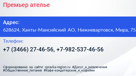 Премьер, ателье по адресу 628624, Ханты-Мансийский АО, Нижневартовск, Мира, 75 в дальнейшем Организация, размещена в следующих категориях:
