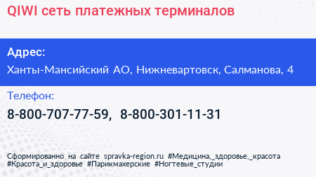 QIWI, сеть платежных терминалов по адресу Ханты-Мансийский АО, Нижневартовск, Салманова, 4 в дальнейшем Организация, размещена в следующих категориях: