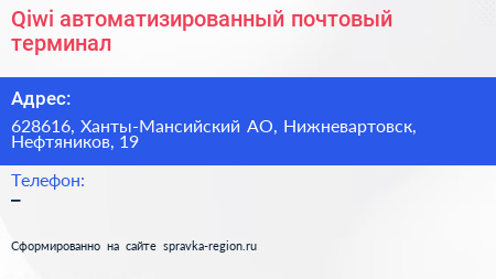 Qiwi, автоматизированный почтовый терминал по адресу 628616, Ханты-Мансийский АО, Нижневартовск, Нефтяников, 19 в дальнейшем Организация, размещена в следующих категориях: