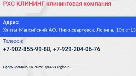 РХС-КЛИНИНГ, клининговая компания по адресу Ханты-Мансийский АО, Нижневартовск, Ленина, 10п ст13 в дальнейшем Организация, размещена в следующих категориях: