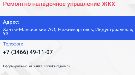 Ремонтно-наладочное управление ЖКХ по адресу Ханты-Мансийский АО, Нижневартовск, Индустриальная, 93 в дальнейшем Организация, размещена в следующих категориях:
