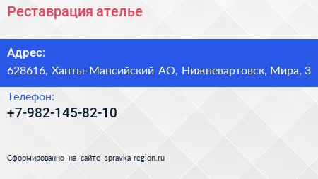 Реставрация, ателье по адресу 628616, Ханты-Мансийский АО, Нижневартовск, Мира, 3 в дальнейшем Организация, размещена в следующих категориях: