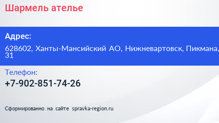 Шармель, ателье по адресу 628602, Ханты-Мансийский АО, Нижневартовск, Пикмана, 31 в дальнейшем Организация, размещена в следующих категориях: