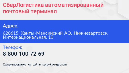 СберЛогистика, автоматизированный почтовый терминал по адресу 628615, Ханты-Мансийский АО, Нижневартовск, Интернациональная, 10 в дальнейшем Организация, размещена в следующих категориях: