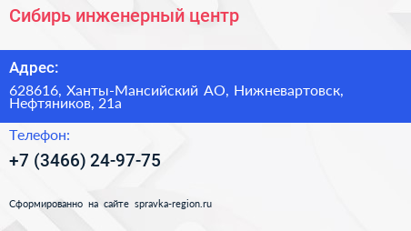 Сибирь, инженерный центр по адресу 628616, Ханты-Мансийский АО, Нижневартовск, Нефтяников, 21а в дальнейшем Организация, размещена в следующих категориях:
