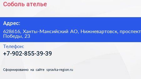 Соболь, ателье по адресу 628616, Ханты-Мансийский АО, Нижневартовск, проспект Победы, 23 в дальнейшем Организация, размещена в следующих категориях:
