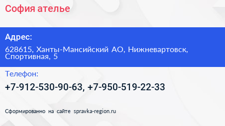 София, ателье по адресу 628615, Ханты-Мансийский АО, Нижневартовск, Спортивная, 5 в дальнейшем Организация, размещена в следующих категориях: