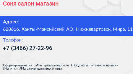 Соня, салон-магазин по адресу 628616, Ханты-Мансийский АО, Нижневартовск, Мира, 11 в дальнейшем Организация, размещена в следующих категориях: