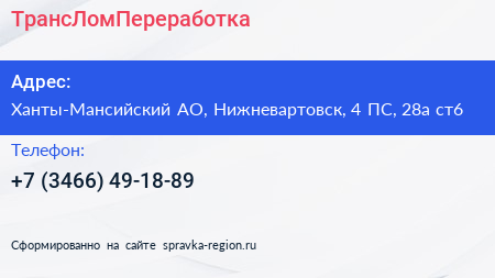ТрансЛомПереработка по адресу Ханты-Мансийский АО, Нижневартовск, 4 ПС, 28а ст6 в дальнейшем Организация, размещена в следующих категориях:
