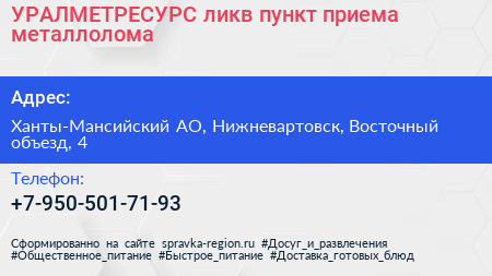 УРАЛМЕТРЕСУРС (ликв), пункт приема металлолома по адресу Ханты-Мансийский АО, Нижневартовск, Восточный объезд, 4 в дальнейшем Организация, размещена в следующих категориях: