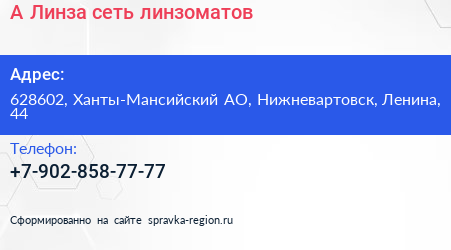 А-Линза, сеть линзоматов по адресу 628602, Ханты-Мансийский АО, Нижневартовск, Ленина, 44 в дальнейшем Организация, размещена в следующих категориях: