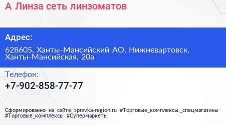 А-Линза, сеть линзоматов по адресу 628605, Ханты-Мансийский АО, Нижневартовск, Ханты-Мансийская, 20а в дальнейшем Организация, размещена в следующих категориях:
