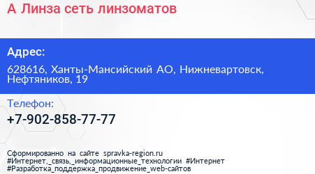 А-Линза, сеть линзоматов по адресу 628616, Ханты-Мансийский АО, Нижневартовск, Нефтяников, 19 в дальнейшем Организация, размещена в следующих категориях: