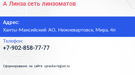 А-Линза, сеть линзоматов по адресу Ханты-Мансийский АО, Нижневартовск, Мира, 4п в дальнейшем Организация, размещена в следующих категориях:
