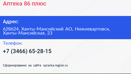 Аптека 86 плюс по адресу 628624, Ханты-Мансийский АО, Нижневартовск, Ханты-Мансийская, 23 в дальнейшем Организация, размещена в следующих категориях: