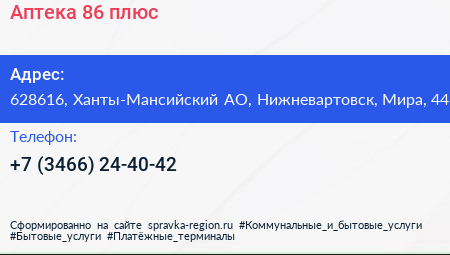 Аптека 86 плюс по адресу 628616, Ханты-Мансийский АО, Нижневартовск, Мира, 44 в дальнейшем Организация, размещена в следующих категориях: