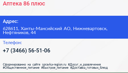 Аптека 86 плюс по адресу 628611, Ханты-Мансийский АО, Нижневартовск, Нефтяников, 44 в дальнейшем Организация, размещена в следующих категориях: